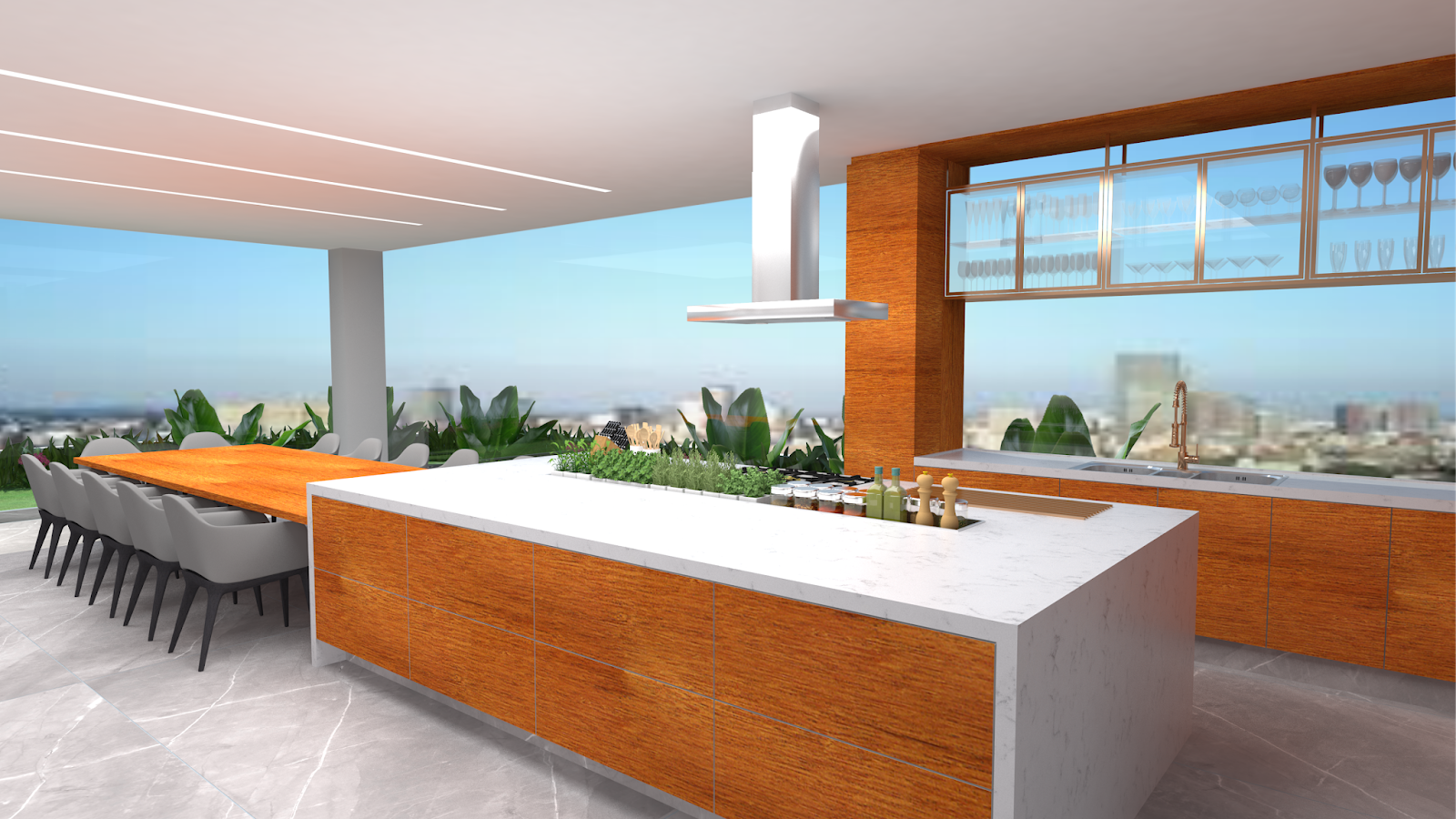 Pergolado Para complementar o jardim e oferecer ainda mais uso ao espaço gourmet, o projeto da arquiteta Valéria Alves incorpora um pergolado com estrutura toda em madeira e teto de vidro, entrando em total harmonia com o ambiente existente, e reformado, criando uma atmosfera aconchegante. A partir de uma vista geral do projeto, entendemos que o pergolado foi a grande sacada para tornar o ambiente mais confortável, perfeito tanto para receber os amigos quanto para passar tempo com a família na rotina cotidiana, é sempre bom incorporar mais funções nestes espaços para oferecer outras atividades.